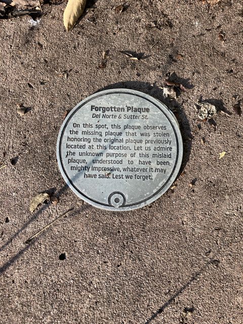 On this spot, this plaque observes the missing plaque that was stolen honoring the original plaque previously located at this location. Let us admire the unknown purpose of this mislaid plaque, understood to have been mighty impressive, whatever it may have said. Lest we forget.