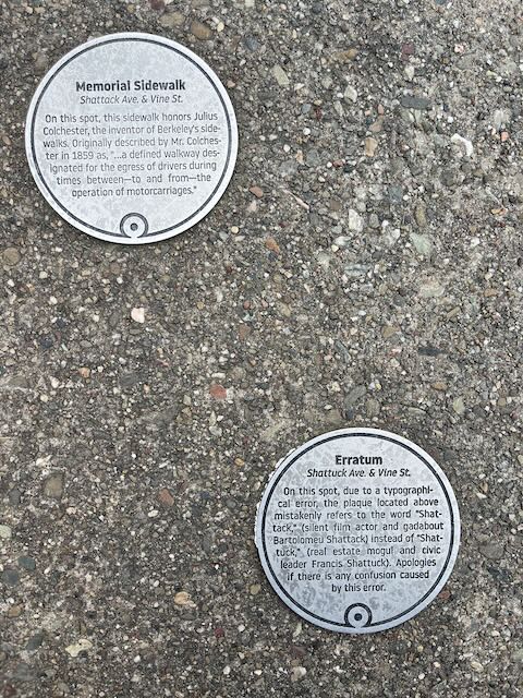 On this spot, this sidewalk honors Julius Colchester, the inventor of Berkeleys sidewalks. Originally described by Mr. Colchester in 1859 as, "…a defined walkway designated for the egress of drivers during times between—to and from—the operation of motorcarriages."